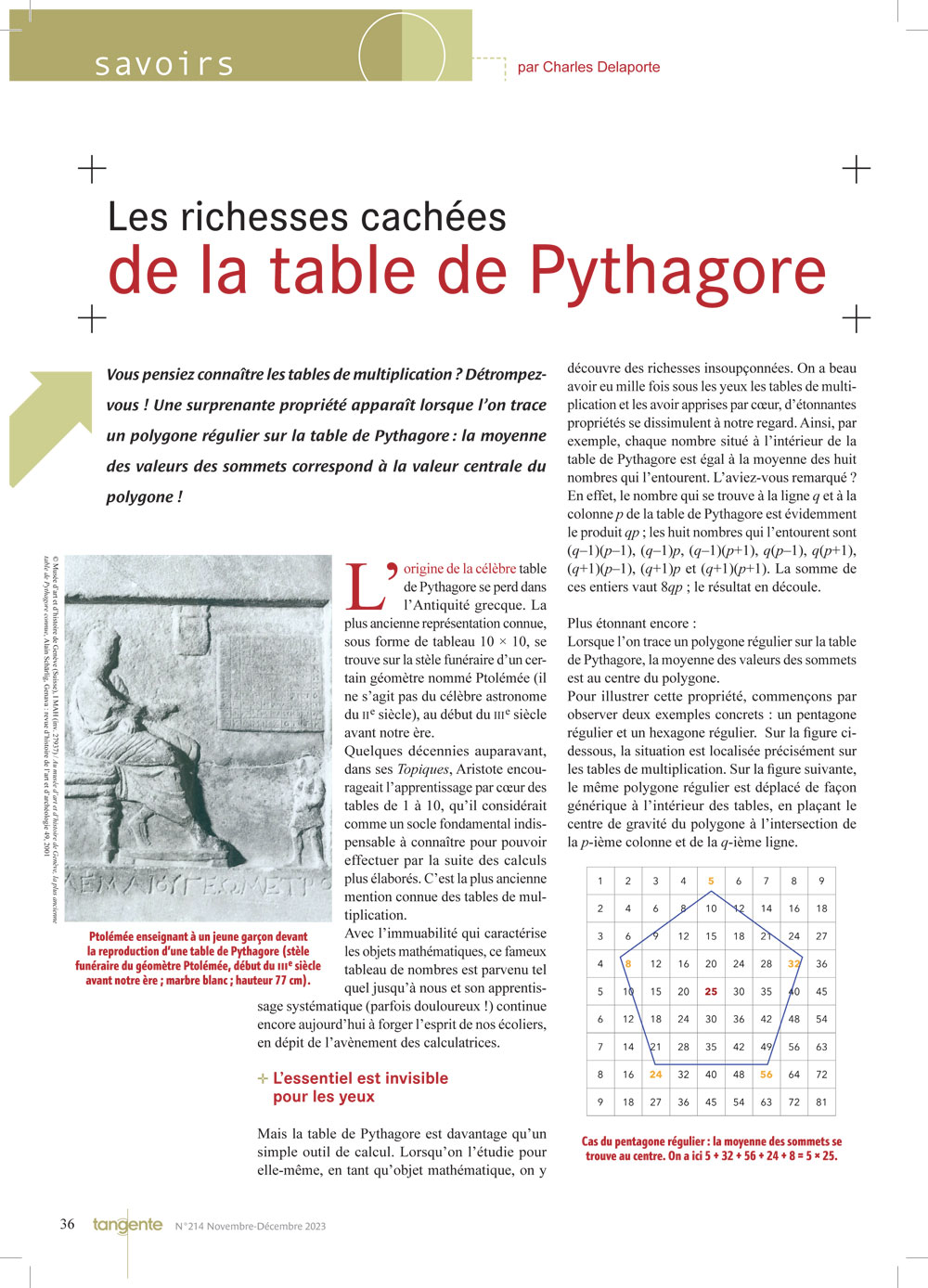 Dans son livre : « Voyage au centre de l’hécatonicosachore », Charles Delaporte présente de nouvelles propriétés de la table de Pythagore.