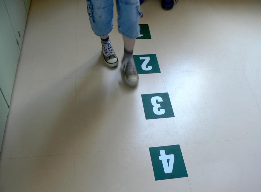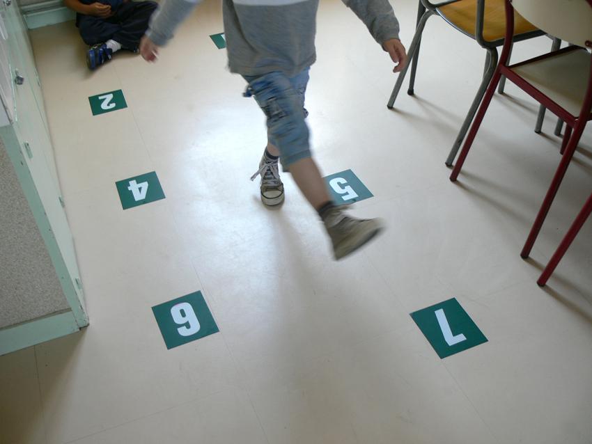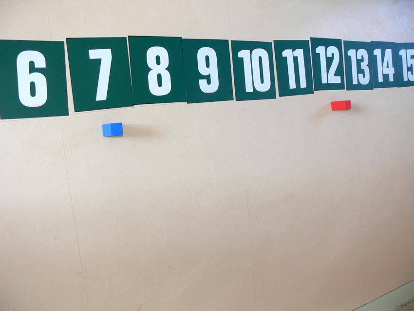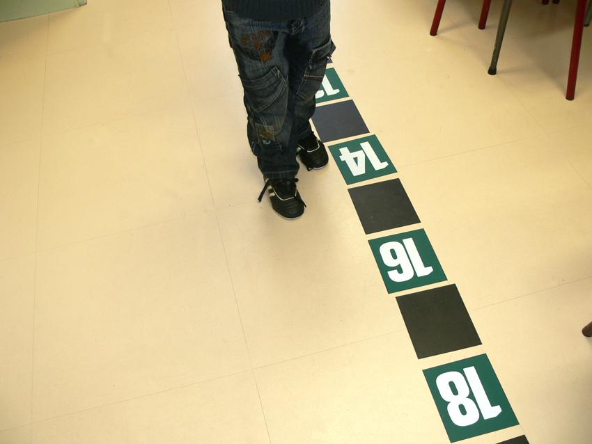 Quand la file est constituée, les déplacements se font en marchant à côté de façon à ce que le numéro soit apparent et en nommant le nombre en face duquel on pose le pied. Il est important de verbaliser l’action : « Je suis au 13, j’avance de 5, j’arrive au… Je suis au 20, je recule de 3, j’arrive au… » Le codage de ces déplacements au sol est l’étape suivante : 13+5=18 , 20-3 =17.