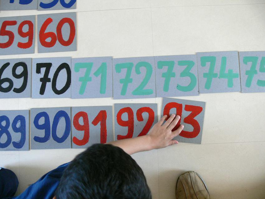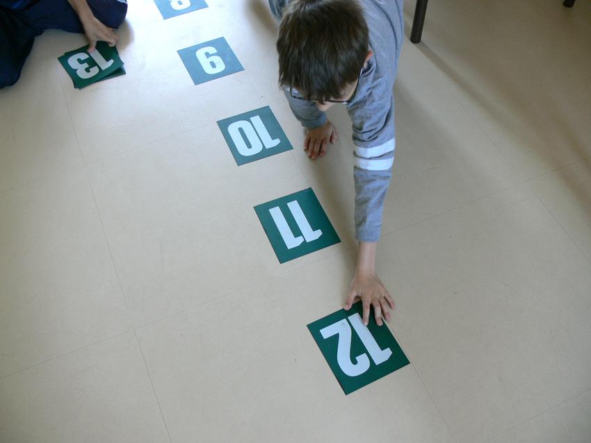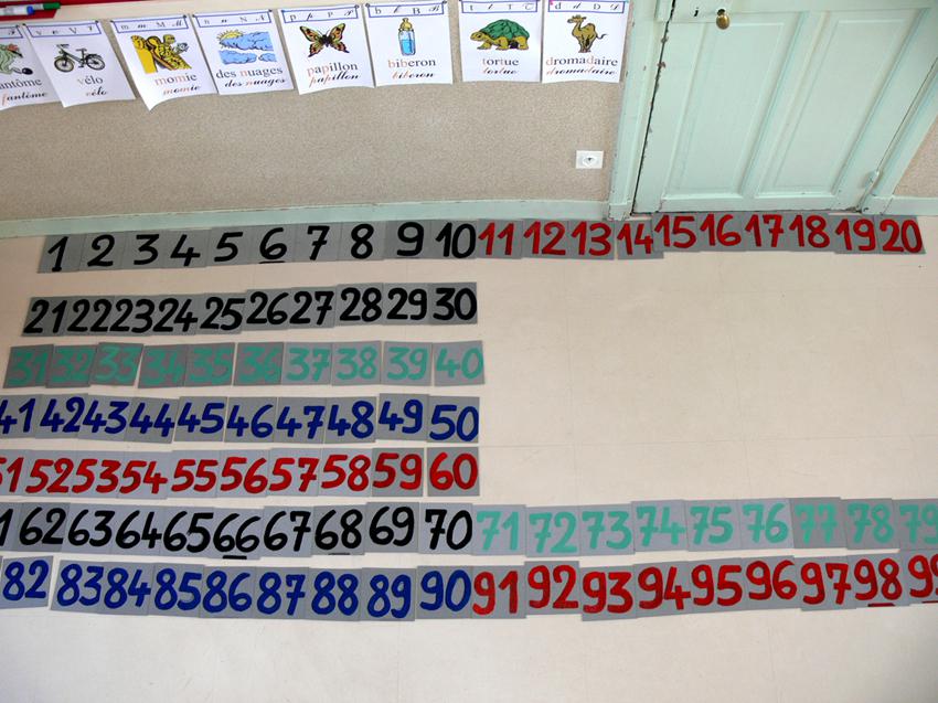 Beaucoup de collègues ont perdu des cheveux à cause de cette façon bien particulière que la France a choisie pour nommer les nombres. Cet exercice de rangement au sol de la suite des nombres permet de bien identifier le problème. On commence par une première rangée avec les nombres jusqu’à 19, puis une deuxième rangée de 20 à 29, on va ensuite à la ligne pour placer les cartons de 30 à 39… etc, la règle étant de commencer une nouvelle ligne dès que le premier mot utilisé pour nommer le nombre change.