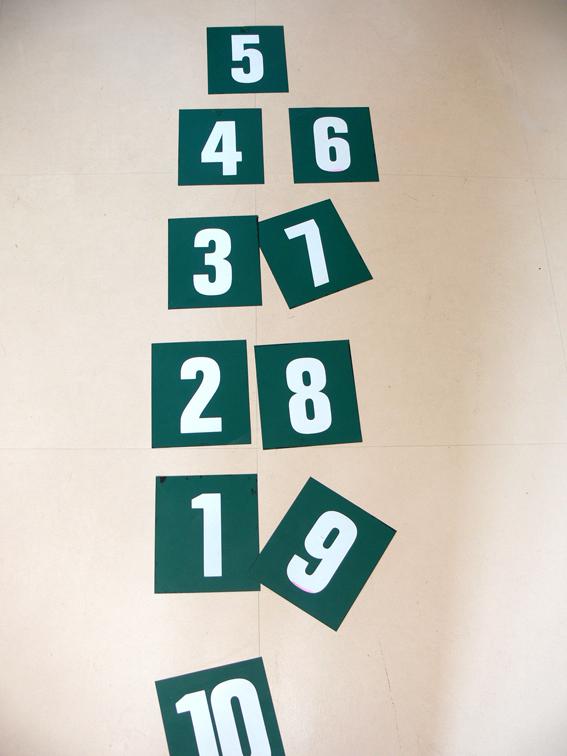 La suite naturelle des nombres est matérialisée au sol à l’aide de cartons peints de dimension 20x20cm. J’ai eu la chance de trouver dans un vide grenier une série de numéros, toute prête, elle était utilisée pour faire des dossards dans des courses de lévriers.