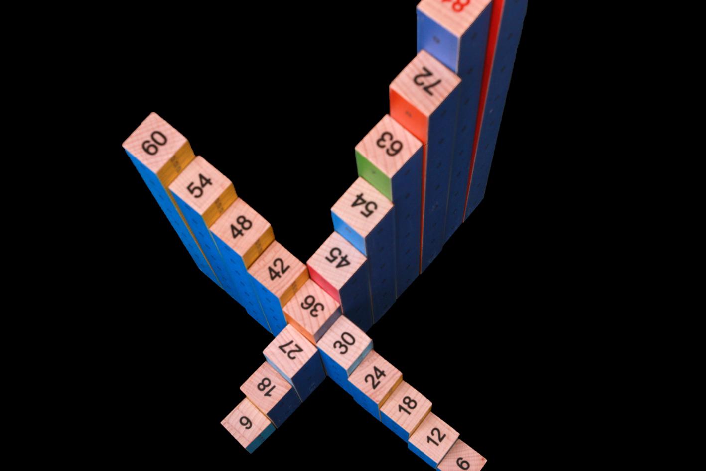 Quand on dispose en ligne le long de la grande barre l’ensemble des 100 résultats de la table de Pythagore, des choses intéressantes apparaissent :
